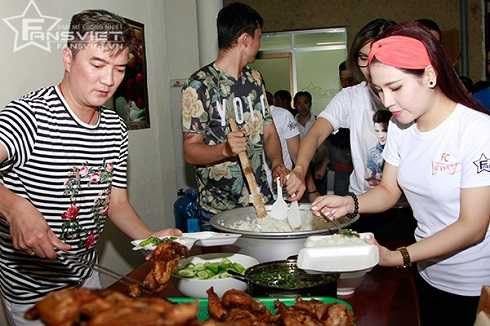 | Đi cùng anh là các thí sinh The Voice năm nay. Nam ca sĩ cùng học trò vào bếp chuẩn bị đồ ăn. |