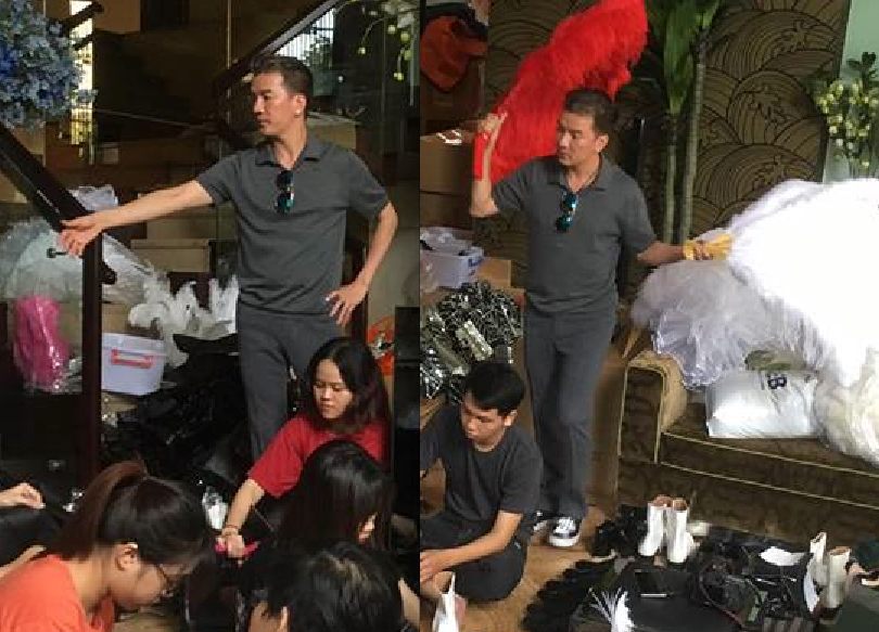 Các nhân viên và người thân giúp Đàm Vĩnh Hưng sấy khô các phụ kiện.