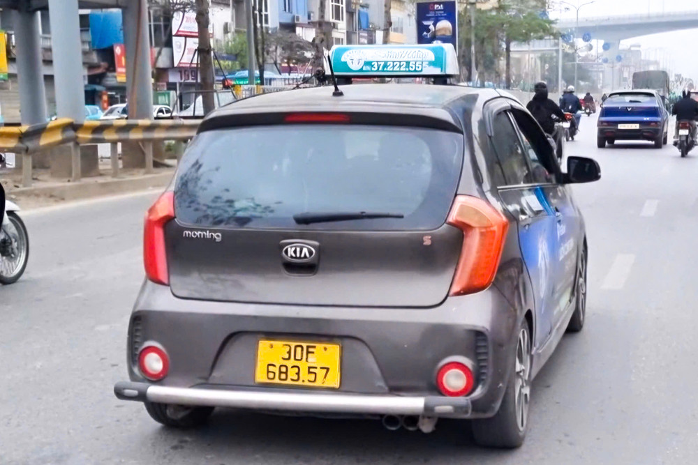 Tài xế dán băng dính để sửa chữ E thành F trên biển số xe taxi. (Ảnh: Thành Long)