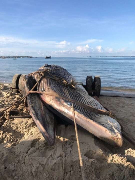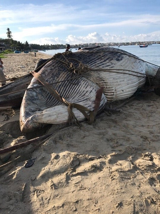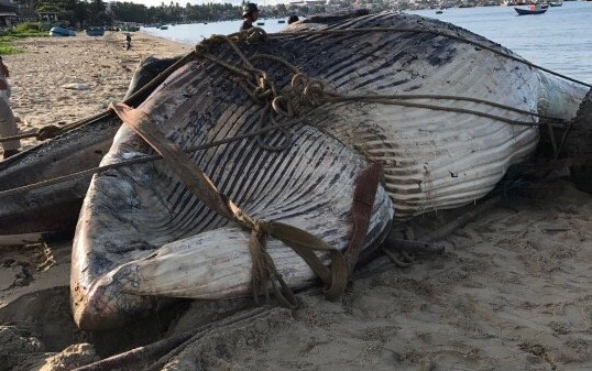 Con cá voi dài khoảng 13 m, bề ngang 2,8 m, nặng gần 15 tấn dạt vào bờ biển Mũi Né.