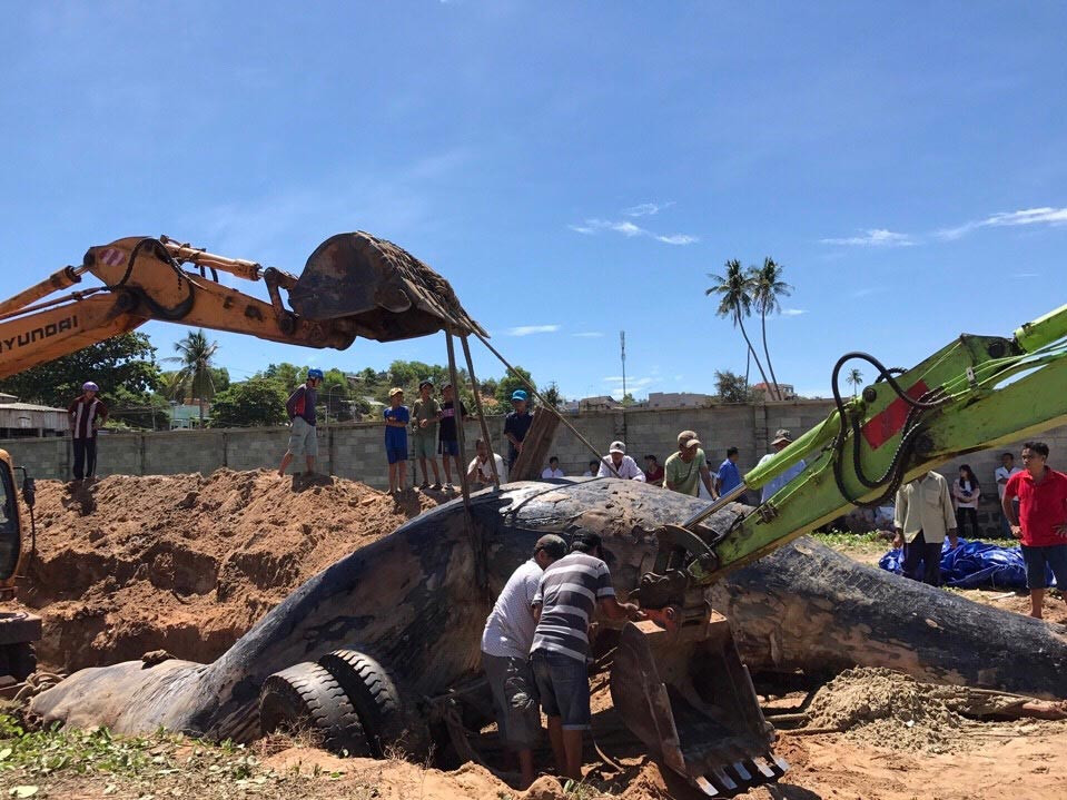 Đến 22h cùng ngày, thi thể cá voi được đưa vào khu vực bờ biển trước Vạn Bình An, phường Mũi Né để tiến hành làm thủ tục chôn cất.