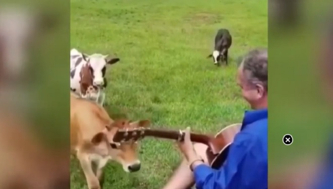 Người đàn ông chơi đàn được một lúc thì các bạn bò cứ lần lượt kéo đến, vây quanh ông, dường như để nghe nhạc.