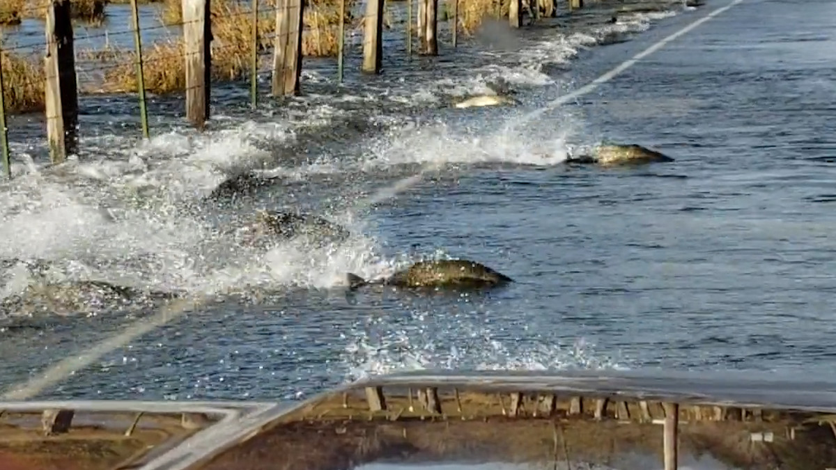 Đàn cá hồi 'lướt' như ca nô trên đường ngập nước