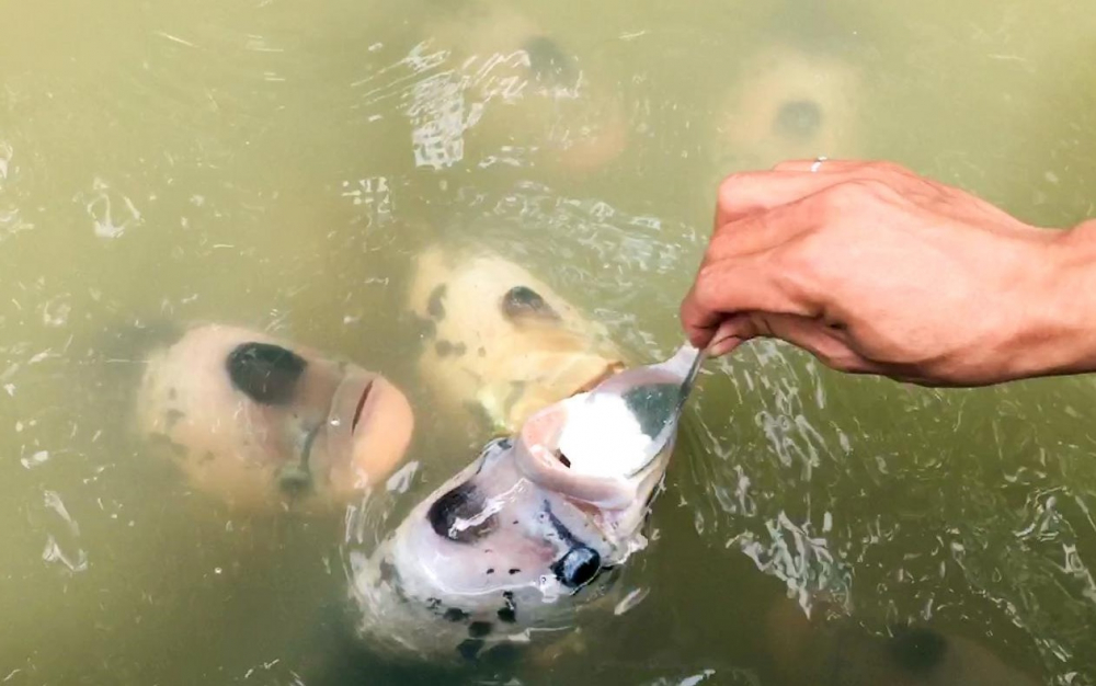 Đàn cá tai tượng khoảng 70 con của anh Nguyễn Ngọc Chiến (27 tuổi, ngụ cồn Sơn, phường Bình Thủy, TP Cần Thơ) khiến nhiều người thích thú bởi chỉ ăn cơm trắng và phải được đút bằng muỗng mới chịu ăn.