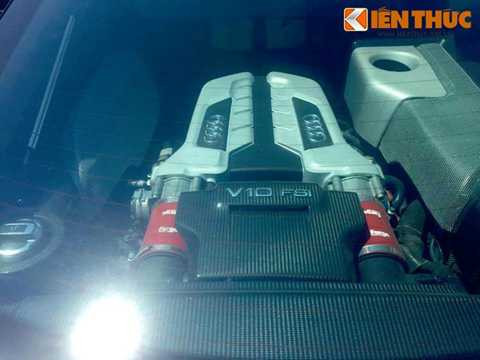 | Nhìn vào nắp xi-lanh, có thể thấy rằng chiếc R8 này thuộc phiên bản V8. Tuy nhiên các phần nắp che ở bên dưới đã được chủ nhân thay bằng nắp của bản V10, làm từ sợi carbon siêu nhẹ. |