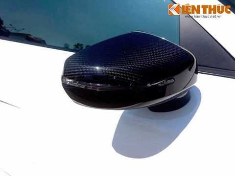 | Ốp gương nguyên bản của R8 cũng đã được thay bằng ốp sợi carbon thật, nổi bật trên nền sơn trắng của chiếc xe. |
