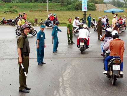 | Cảnh sát giao thông và lực lượng dân quân, công an xã Hòa Sơn lập hàng rào phân luồng giao thông |