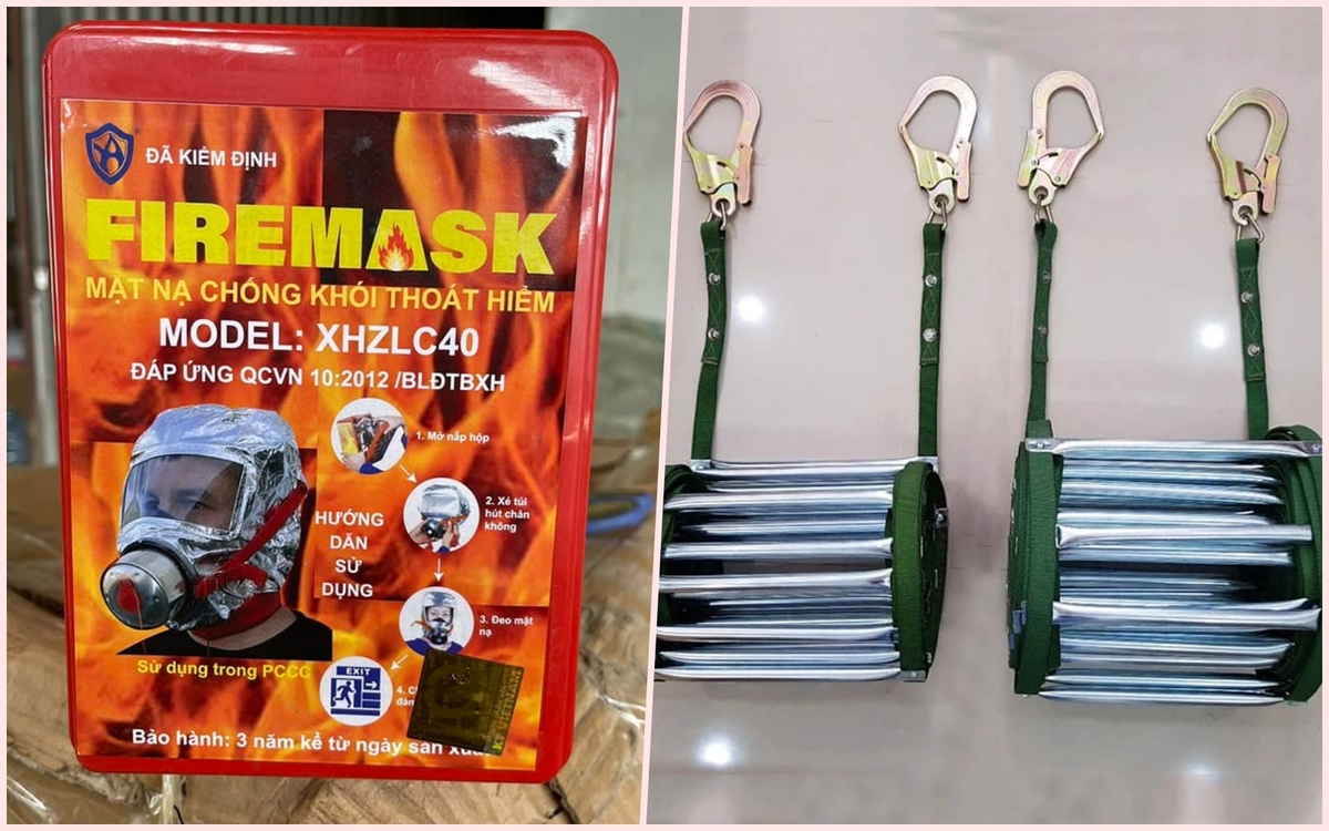 Gia đình chị Đào có 3 người, tổng chi phí mua thiết bị hết 1,5 triệu đồng, bao gồm 3 mặt nạ chống khí, hai thang dây dài 30m và 1 bình cứu hỏa loại 3kg.