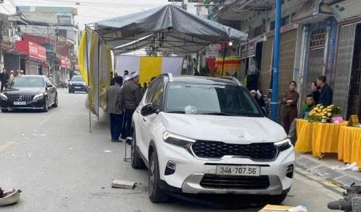 Chiếc ô tô nhãn hiệu KIA lao vào rạp đám tang bắc dưới lòng đường ngày 31/12/2024. (Ảnh: Báo Hải Dương)