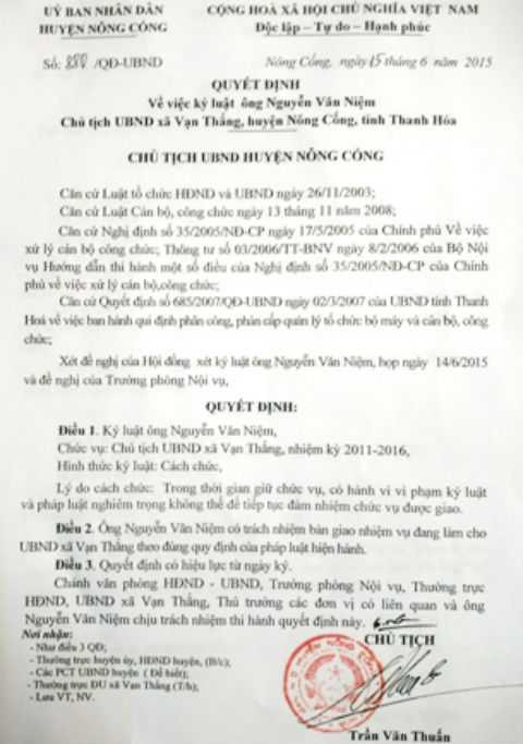 Trên cơ sở đề nghị của Hội đồng xét kỷ luật, Chủ tịch UBND huyện Nông Cống ra quyết định hình thức kỷ luật cách chức đối với ông Nguyễn Văn Niệm – Chủ tịch UBND xã Vạn Thắng.