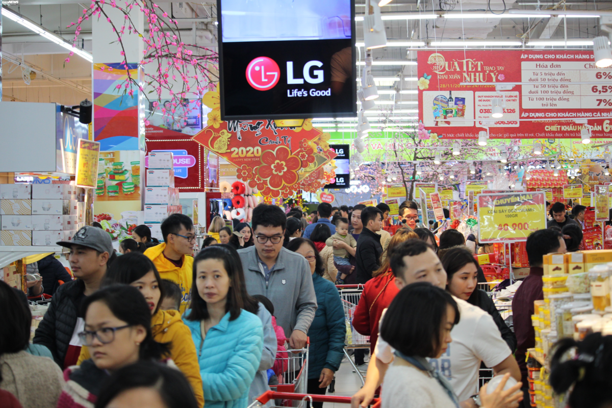Hôm nay và ngày mai là dịp cuối tuần cuối cùng của năm Kỷ Hợi. Chỉ còn ít ngày nữa là đến Tết Nguyên đán Canh Tý 2020. Do bận rộn, người dân Hà Nội phải tranh thủ thời gian rảnh rỗi cuối tuần để đi mua sắm Tết. Tâm lý này khiến dòng người đổ xô về các siêu thị đông như trảy hội.