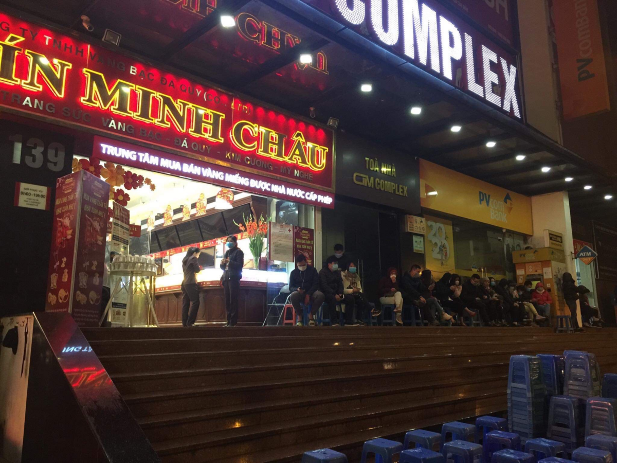 6h sáng, trên đường Cầu Giấy, người mua xếp hàng dưới mưa lạnh đợi cửa hàng giao dịch để mua vàng.