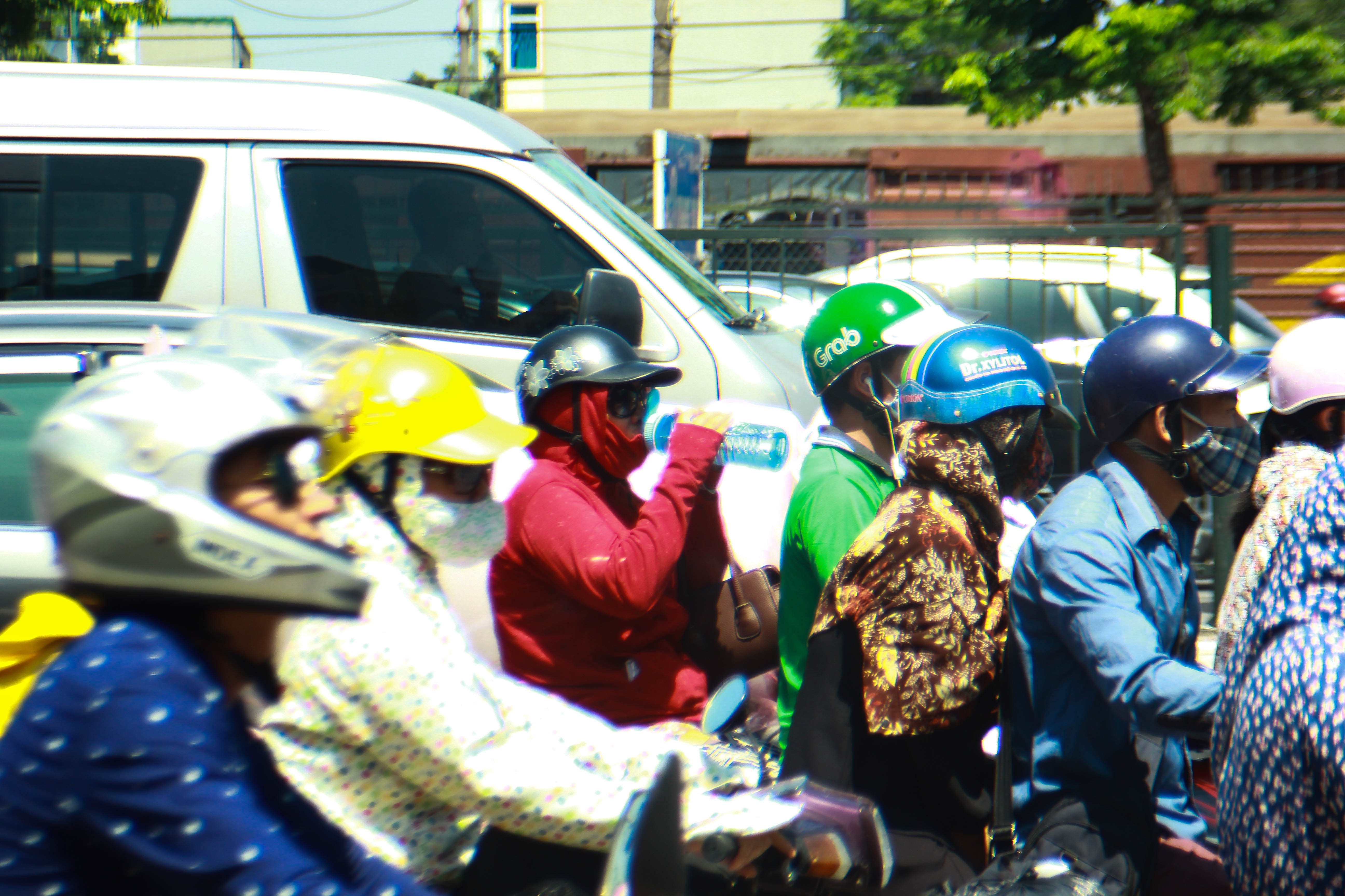 Trong khi đợi đèn đỏ, nhiều người tham gia giao thông lao lên vỉa hè nơi có bóng mát để tránh nắng.
