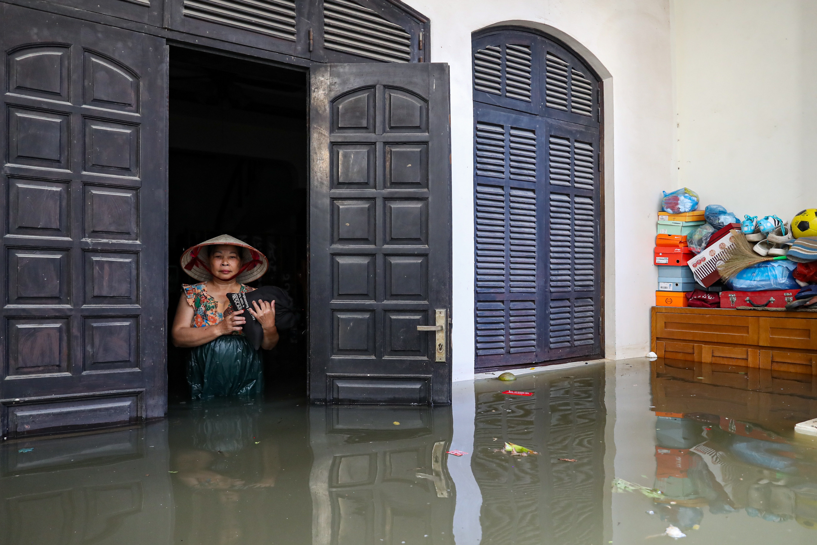 Cách đó không xa hộ gia đình bà Xuân cũng ngập hơn 1m nước. "Do ngập sâu, gia đình tôi phải kê cao tủ lạnh, máy giặt để tránh hư hỏng và chuyển lên tầng 2 sinh sống. Những ngày đầu, các cháu phải đi thuyền đến trường, nhưng bất tiện nên tôi gửi cháu ở nhờ gần trường để ăn ngủ. Việc thiếu nước sạch cũng khiến gia đình khốn khổ, vợ chồng phải thay nhau sang nhà họ hàng vệ sinh cá nhân, ăn uống rồi quay về trông coi nhà", bà Xuân nói.