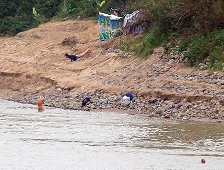 | Tại bãi giữa sông Hồng, một số thanh niên theo bạn bè xuống định thử sức nhưng rồi cũng chỉ đứng trên bờ nhìn chứ không dám lội xuống sông bơi. Ảnh: VNE |