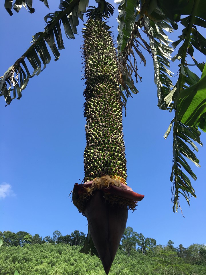 Hiện những nải chuối đầu tiên đã bắt đầu chín nhưng phần hoa bên dưới còn phát triển.