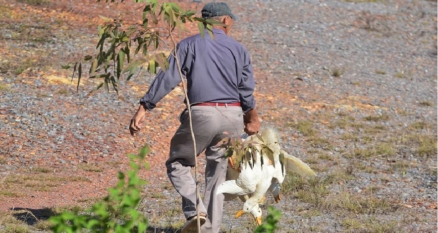 Người đàn ông xách trên tay ít nhất 3 con vịt từ chiếc xe tải gặp nạn đi về phía rừng bạch đàn. (Ảnh: Văn Được)