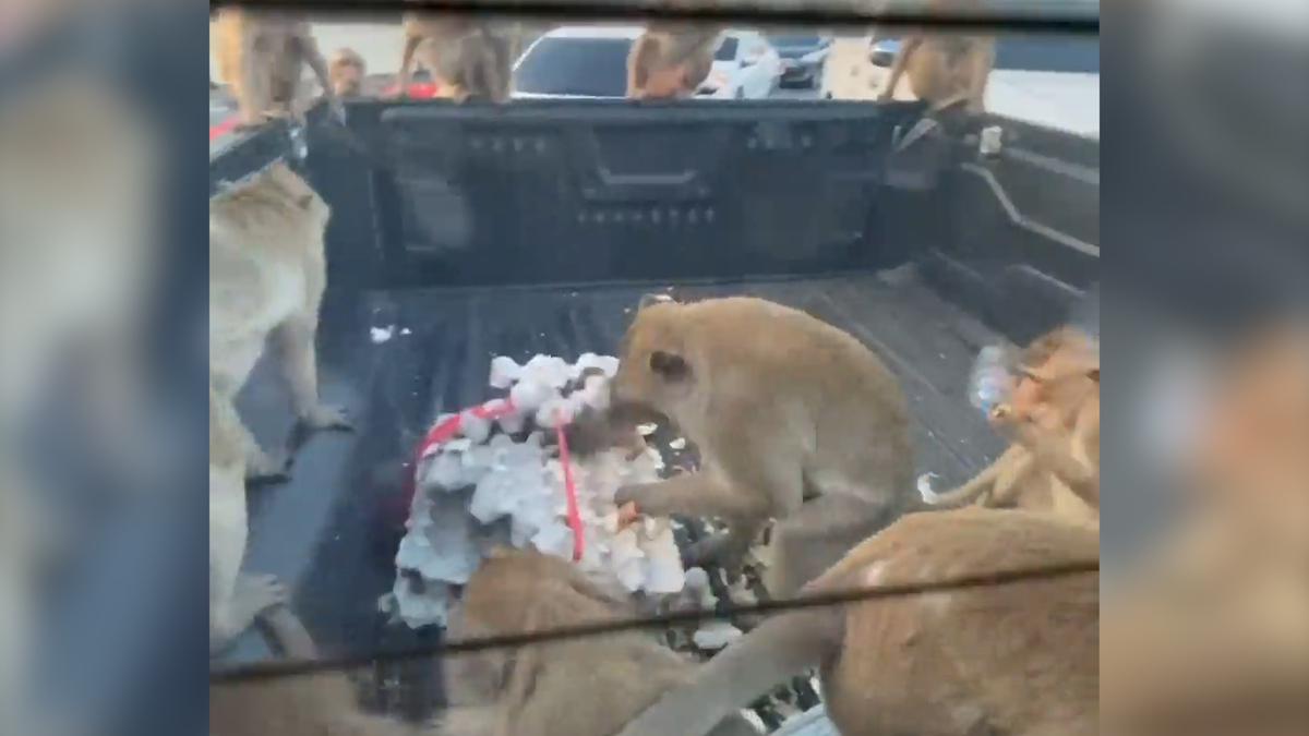 Đàn khỉ hàng chục con tại tỉnh Lopburi, Thái Lan điên cuồng nhảy lên xe bán tải lấy trộm trứng gà, chưa đầy một phút, số trứng gà bị đàn khỉ dọn sạch.