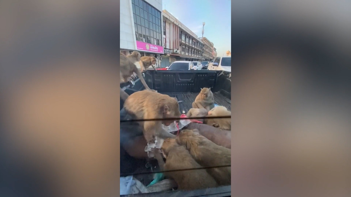 Đàn khỉ lao lên ô tô cướp trứng gà nhân lúc tắc đường