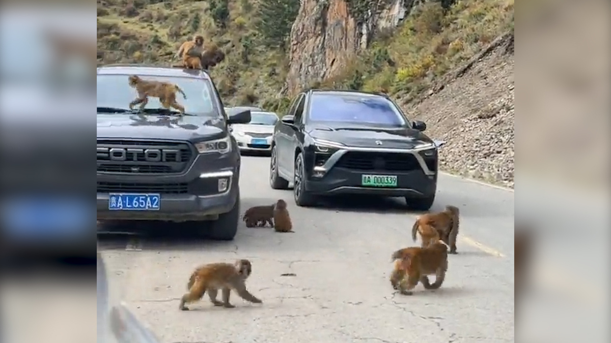 Đàn khỉ lông vàng xâm chiếm một tuyến phố tại tỉnh Tứ Xuyên, Trung Quốc và trèo lên đầu xe ô tô nghịch ngợm.