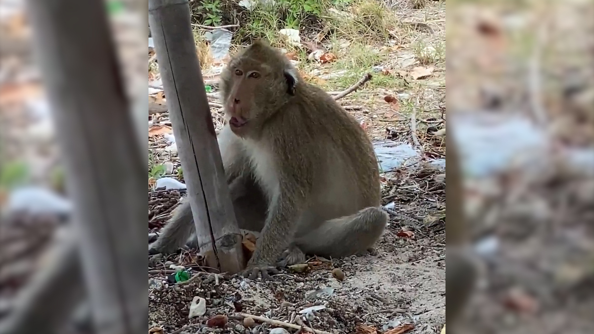 Đàn khỉ tại tỉnh Chonburi, Thái Lan đánh cắp những lon bia của người câu cá và uống hết sạch, một con trong đàn say xỉn ngã vào thân cây.