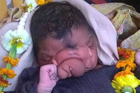 Một bé gái mới sinh được dân làng ở Uttar Pradesh tôn thờ như một vị thần Ấn Độ do khuôn mặt biến dạng giống như mặt voi.