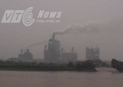 | Các nhà máy giữa cánh đồng thôn Trại Xanh và Châu Xá cùng tuôn tỏa khói bụi khiến không gian mờ ảo giữa ban ngày |