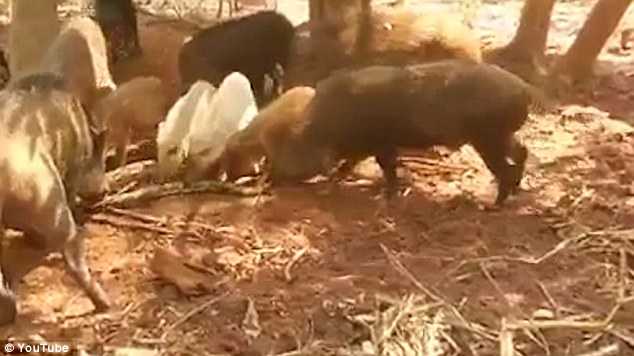 Đoạn video trên Daily Mail quay cảnh ít nhất 8 con lợn rừng lao vào bao vây từ mọi phía trước khi tấn công, xé xác con trăn trong giận dữ.