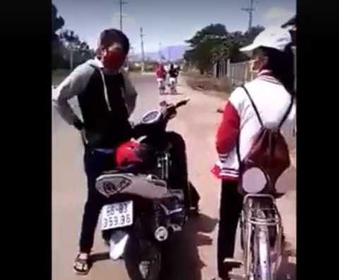 Nam thanh niên vờ đi vòng sang cô gái nói nhỏ nhẹ: "Anh nói cho em nghe, em còn con nít đó". Nói chưa dứt lời, nam thanh niên bất ngờ tung một tát như trời giáng vào mặt nữ sinh khiến nữ sinh ngã ngửa ra sau từ trên xe đạp rơi lăn quay xuống đất.
