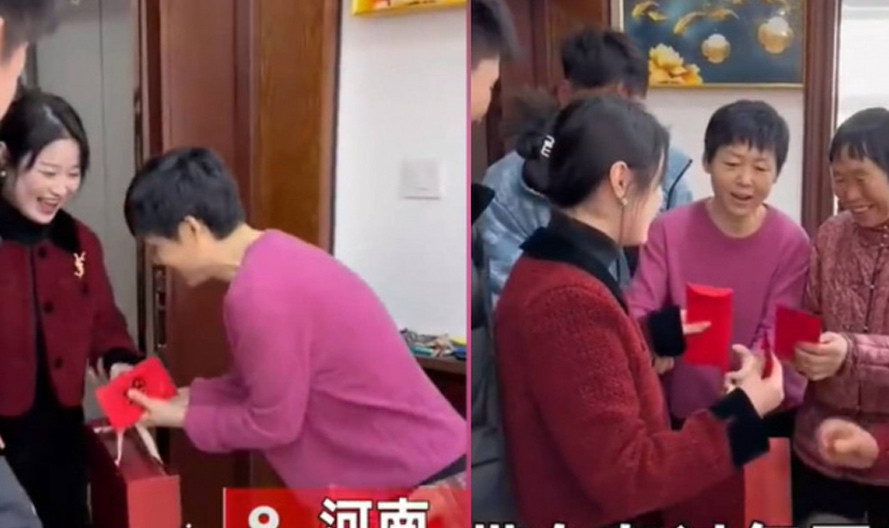 Lúc đó, cô gái đang ôm hai hộp quà, một bà lão đứng bên vội đỡ lấy hộp quà, rồi dúi phong bao lì xì vào tay cô. Cô gái cũng nhận được phong bao lì xì từ những người lớn khác. Ngoài sự nhiệt tình đón khách này, không khí sôi nổi, hòa thuận của gia đình cũng khiến cô gái thấy ấm áp và là điều khiến nhiều cư dân mạng xuýt xoa ghen tị.