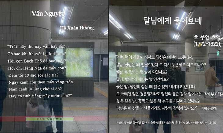 Theo hình ảnh được trang "Thông tin Hàn-Việt" đăng tải, bài thơ "Vấn Nguyệt" của nhà thơ Hồ Xuân Hương xuất hiện bằng cả tiếng Việt và tiếng Hàn trên màn hình ga tàu điện ngầm ở Hàn Quốc. Nhiều cư dân mạng bày tỏ sự ngạc nhiên và thích thú khi "bắt gặp" tiếng Việt một cách rất đặc biệt ở nước bạn.