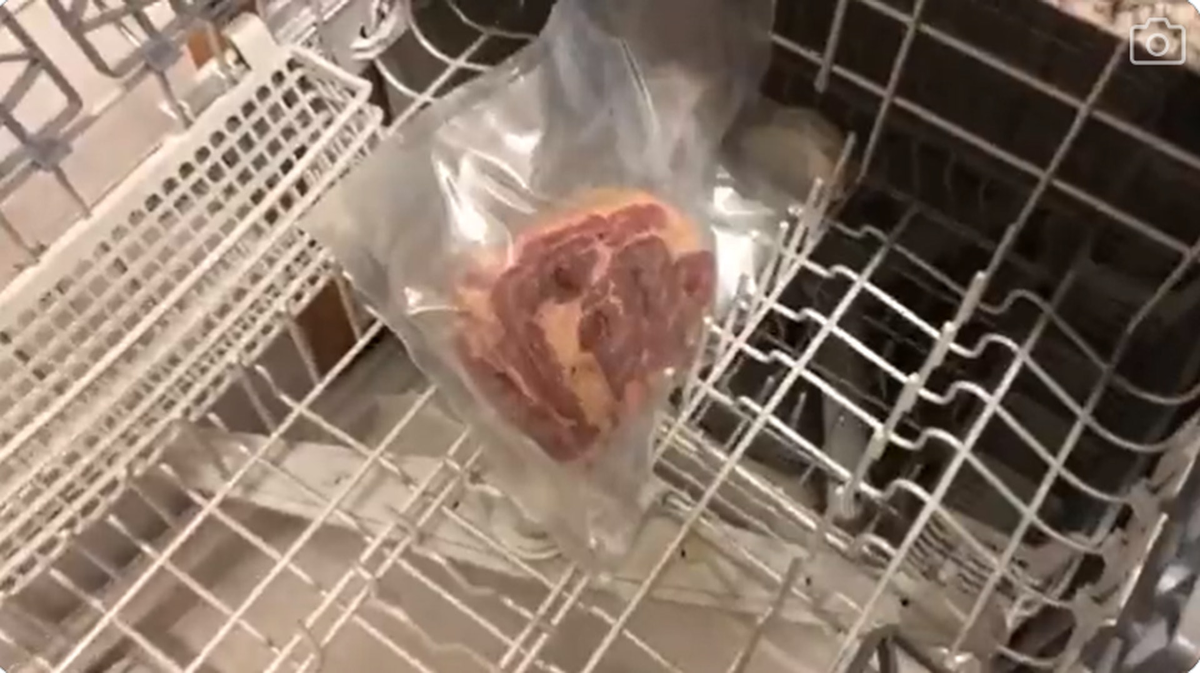 Anh chàng đã chia sẻ các bước để làm bít tết chín vừa bằng máy rửa bát. Đầu tiên, anh ra ướp thịt với muối, sau đó cho thịt vào một chiếc túi nhựa rồi dùng máy hút chân không để hút hết không khí ra khỏi túi. Tiếp theo, Micheal đặt túi thịt vào ngăn đựng bát của máy rửa bát rồi nhấn nút bắt đầu quá trình rửa như bình thường.