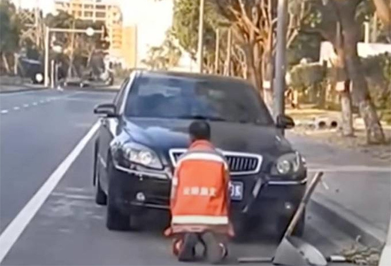 Đoạn video ghi lại cảnh một người đàn ông có vẻ lớn tuổi mặc đồng phục công nhân vệ sinh cầm chổi quỳ trước chiếc xe hơi màu đen được chia sẻ trên mạng xã hội Trung Quốc thu hút hơn 8 triệu lượt xem cùng vô số bình luận phẫn nộ.