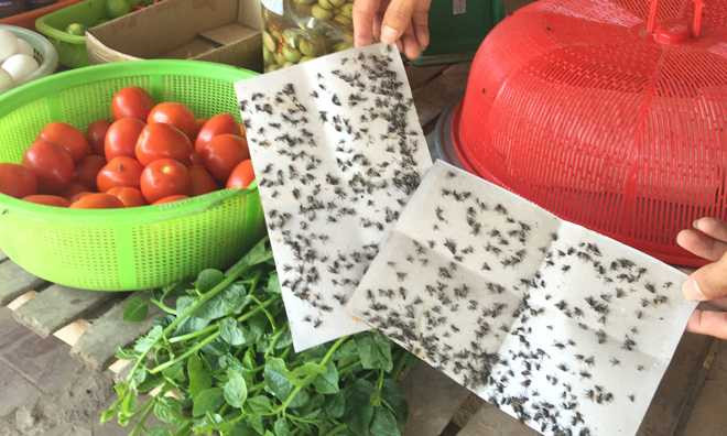 Gian bếp phải quây kín để ruồi không lọt vào, nếu không đậy kỹ thức ăn thì chỉ vài phút, ruồi sẽ bậu đen kịt. Cùng chung cảnh ngộ, bà Nguyễn Thị Dinh, bán rau, thịt cạnh đó đưa chúng tôi xem vỉ ruồi mới đặt vài tiếng đã kín hết chỗ. “Cứ 2, 3 tháng một lần, cơ quan chức năng cử cán bộ tới để phun thuốc diệt ruồi, nhưng đâu vẫn hoàn đấy”, bà Dinh nói.