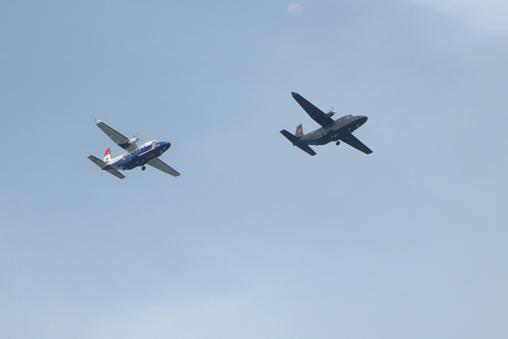 Hai chiếc máy bay C212i thực hiện bài bay biên đội ngay trên khu vực sân bay Gia Lâm.
