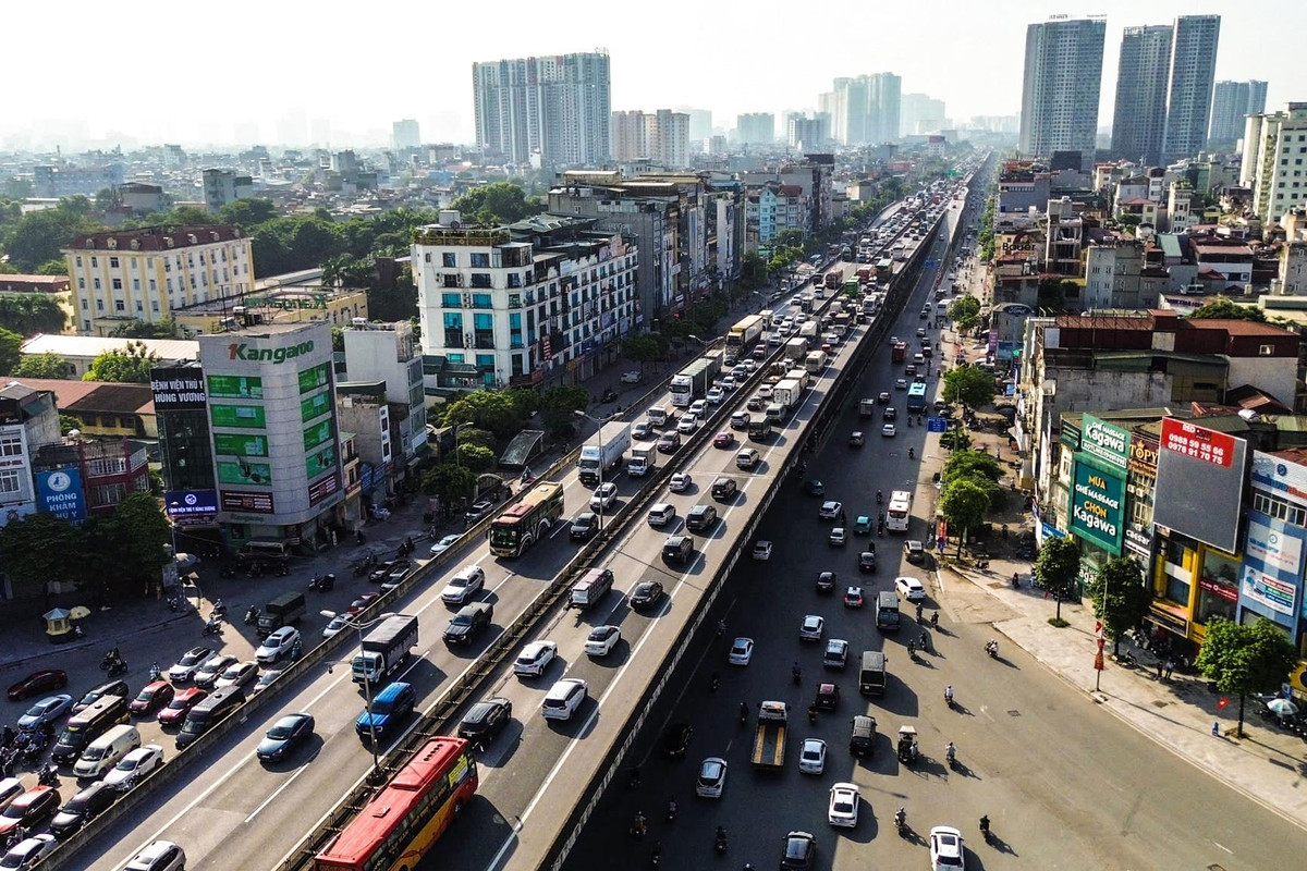 Lúc hơn 7h, tại khu vực đường Vành đai 3 trên cao, tình trạng ùn ứ xảy ra tại các làn đường theo hướng rời Hà Nội.
