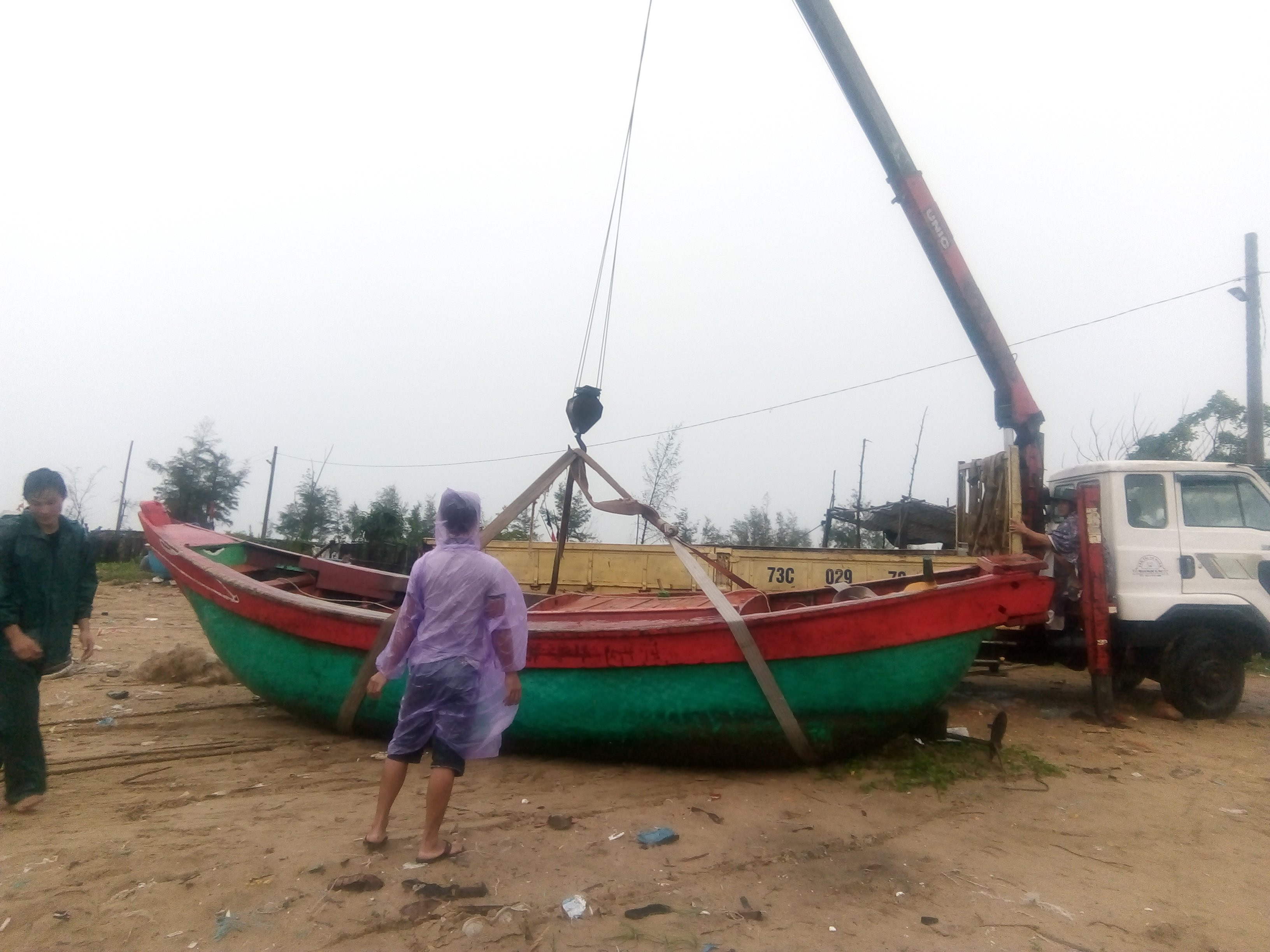 ...dùng cả xe cẩu đưa thuyền lên bờ tránh bão Sơn Tinh.