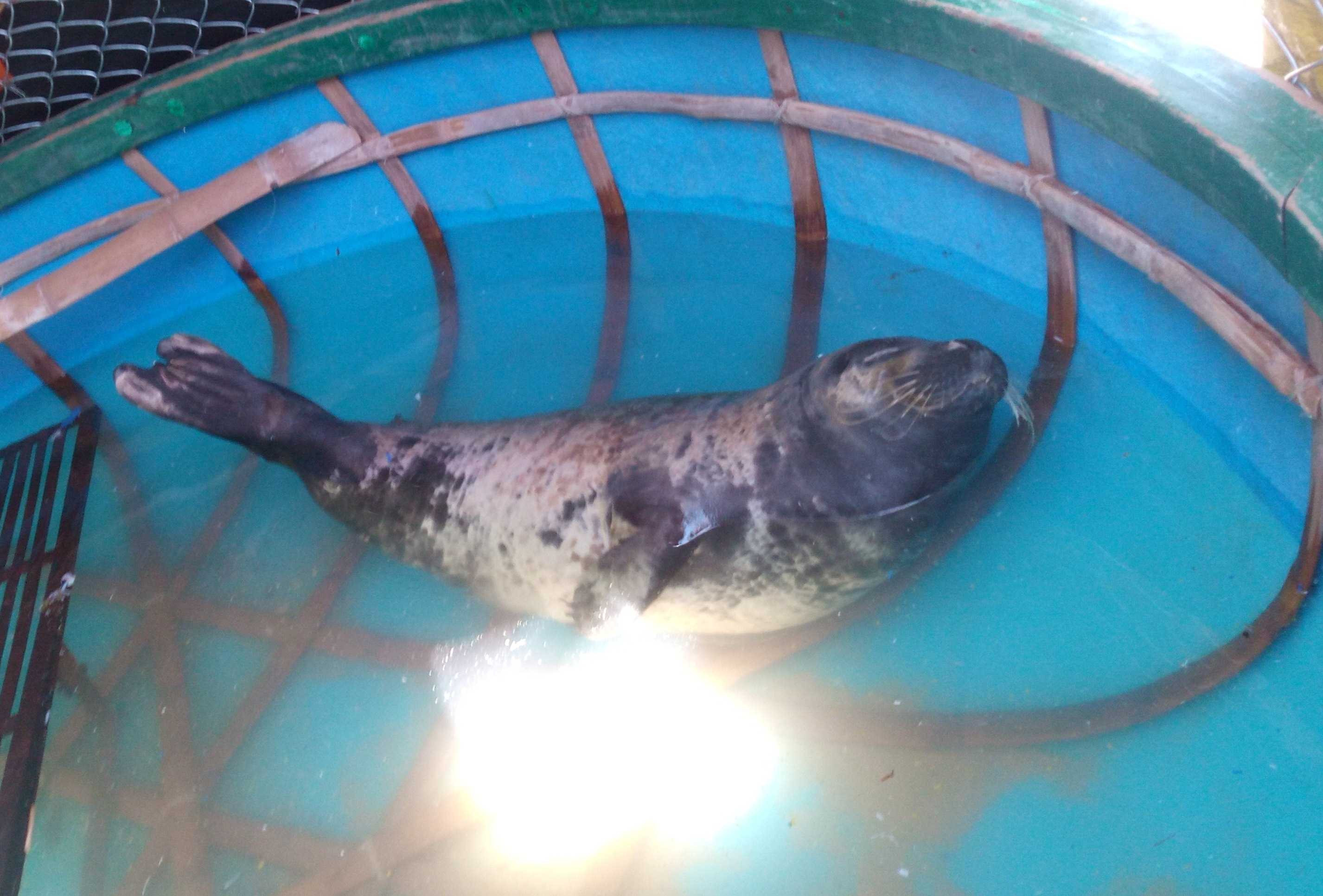 Trước đó, khoảng 14h ngày 15/8, con hải cẩu này vào gần bờ và mắc vào lười của ngư dân. Sau đó, người dân đã dùng thúng cho nước vào để nuôi nhốt hải cẩu này và báo cho cơ quan chức năng.