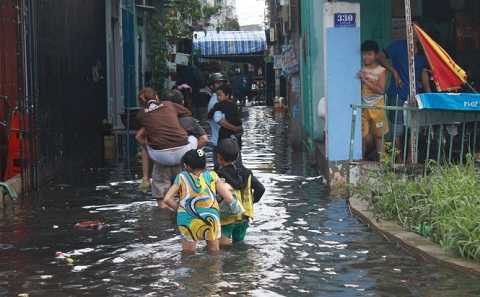Các con hẻm xung quanh con đường trên có đoạn ngập tới nửa mét. Nhiều người dân đi đám tang tại một hộ dân khu vực đường Ấp Chiến Lược cũng phải lội nước quá đầu gối.