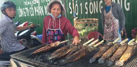 “Ngày thường tôi chỉ bán khoảng 100 con. Thứ Bảy, Chủ nhật thì khoảng 200 con, nhưng ngày mồng 10 tháng giêng thì tôi bán được khoảng 3000 con”, chị Cúc chủ sạp cá lóc nướng Cúc Bụi cho hay.