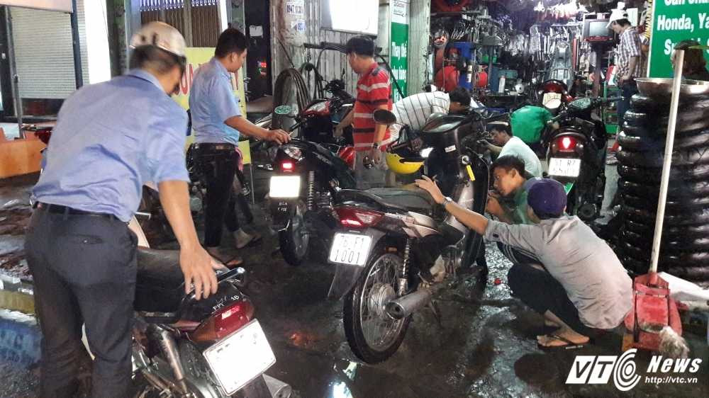 Hơn 1h sáng nhưng các tiệm sửa xe tại TP.HCM vẫn phải hoạt động hết công suất. Nhiều phương tiện hư hỏng nên khách phải xếp hàng ngồi chờ thành hàng dài.