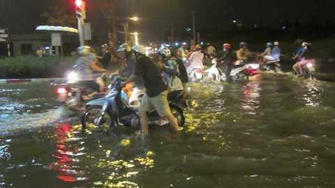 Bác Nguyễn Văn Sang – một người dân sống tại đường Bùi Hữu Nghĩa (quận Bình Thạnh, TP.HCM) cho biết: “Chưa bao giờ người dân Sài Gòn lại khốn khổ với triều cường như cuối năm nay, khi mà triều cường cứ ngày càng cao hơn trước. Tuy không gây thiệt hại quá lớn về vật chất, nhưng triều cường khiến cho người dân phải mệt mỏi, vì suốt ngày phải nghĩ ra cách để đối phó với con nước”.Giao thông đi lại khó khăn vì triều cường dâng cao, gây ngập lụt (Ảnh: N.D)