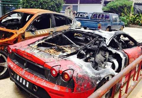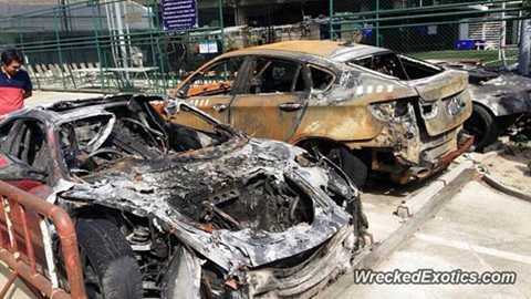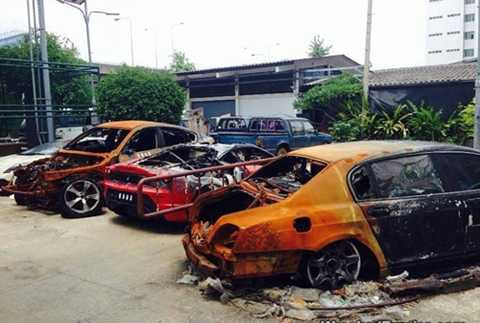 Tại một đại lý xe hơi ở Bangkok (Thái Lan), một nhóm 4 chiếc siêu xe và xe sang bị phá hủy trơ trọi sau khi dính hỏa hoạn.