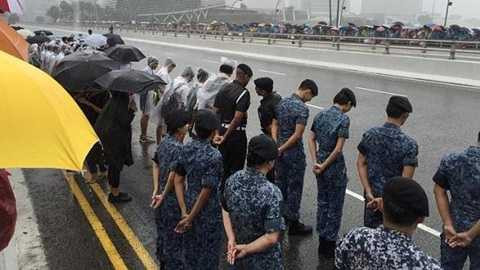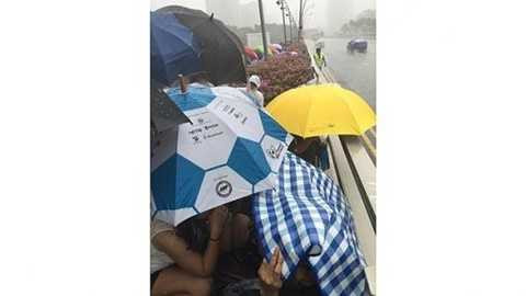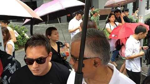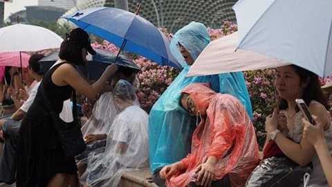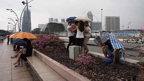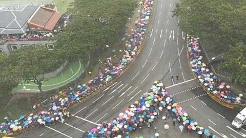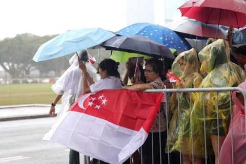 | Người dân chờ đợi đám tang ông Lý Quang Diệu đi ngang trên đường phố dưới trời mưa to từ sáng sớm ngày 29/3 - Ảnh: Stratstimes |