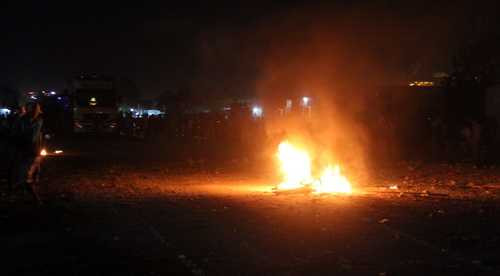 Đến chiều nay, một số người tiếp tục ném bom xăng tạo tường lửa giữa quốc lộ. Hàng nghìn xe kẹt cứng suốt 20 km.