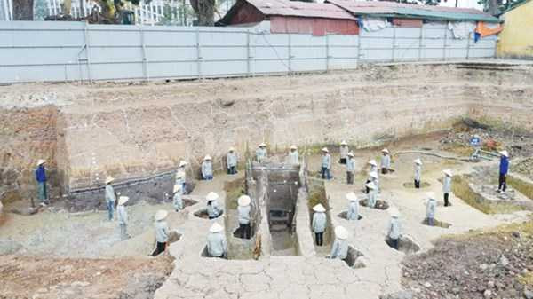 | Một phần di tích phát lộ tại Hoàng thành. Ảnh: Viện Hàn lâm Khoa học Xã hội VN |