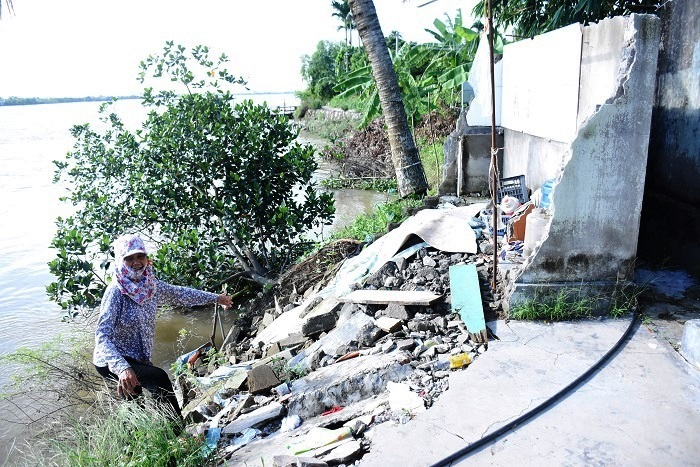 “Trước đây nhà tôi có tường bao, bể lọc nước, 2 căn nhà, khu vệ sinh, nhà bếp được xây dựng kiên cố. Từ nhà ra mé bờ sông là 11m, trẻ con còn đánh bóng nhưng giờ tường bao mất rồi, nhà cách bờ sông cũng chỉ vài mét, trẻ nhỏ phải di dời đi chỗ khác.