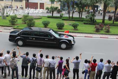 Khi chiếc xe chở Tổng thống đi tới, những tiếng "hello", "wellcome to Viet Nam" được người dân vang lên. Tổng thống Obama ngồi 1 trong 2 chiếc Cadillac One.