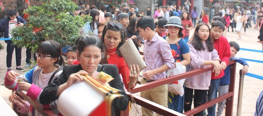 Người dân xếp hàng mua vé vào Văn Miếu thành hàng dài.