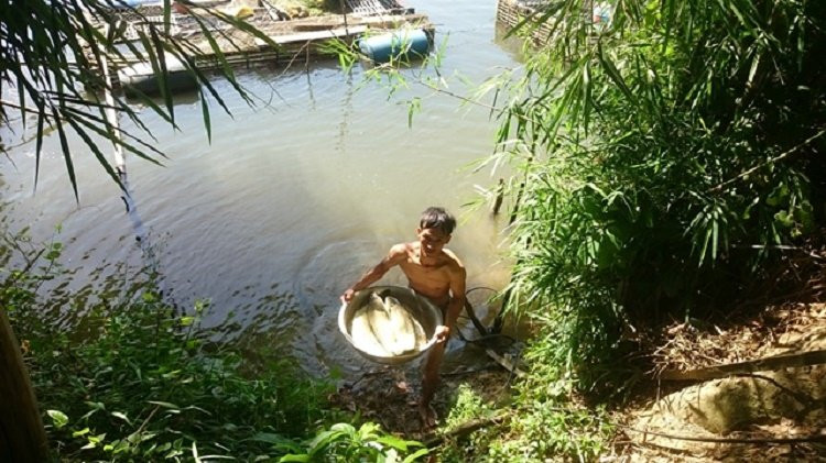 Người dân đang vớt cá chết từ lồng lên bờ để bán. (Ảnh: Nguyễn Vương)